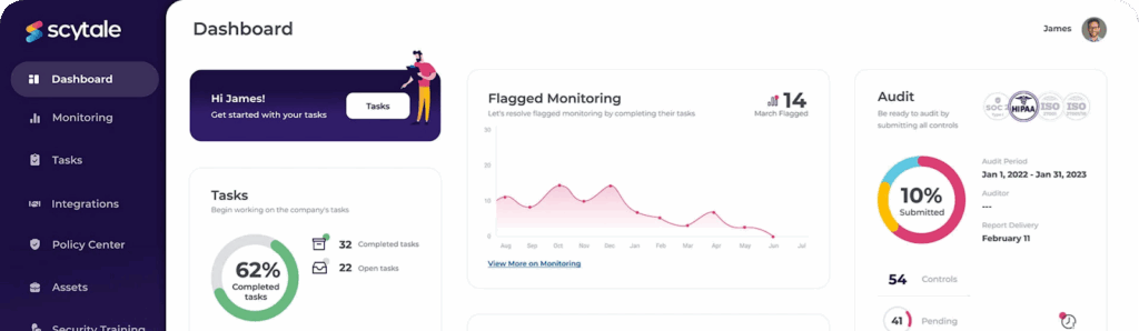 Scytale provides an automated platform for HIPAA compliance that helps healthcare organizations manage privacy and security requirements. The solution supports the compliance lifecycle from risk assessment to audit readiness while offering built-in control monitoring, evidence collection, and employee training.