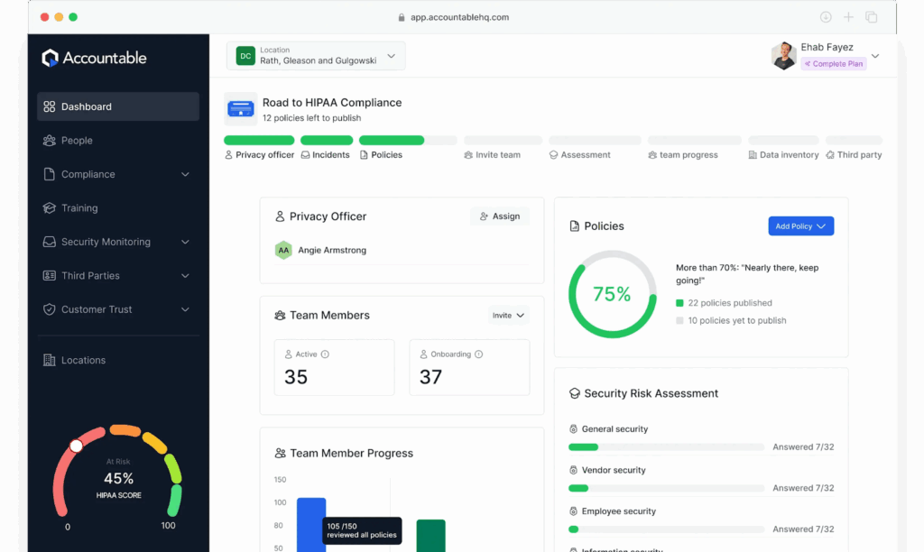 - Employee training and access control: Launches HIPAA training programs and enforces access policies through a dedicated module.