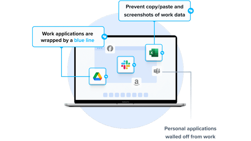 Venn’s Blue Border™ protects company data and applications on BYOD computers used by contractors and remote employees. Similar to an MDM solution but for laptops – work lives in a company-controlled Secure Enclave installed on the user’s PC or Mac, where all data is encrypted and access is managed. Work applications run locally within the Enclave – visually indicated by Venn’s Blue Border™ – protecting and isolating business activity while ensuring end-user privacy.
