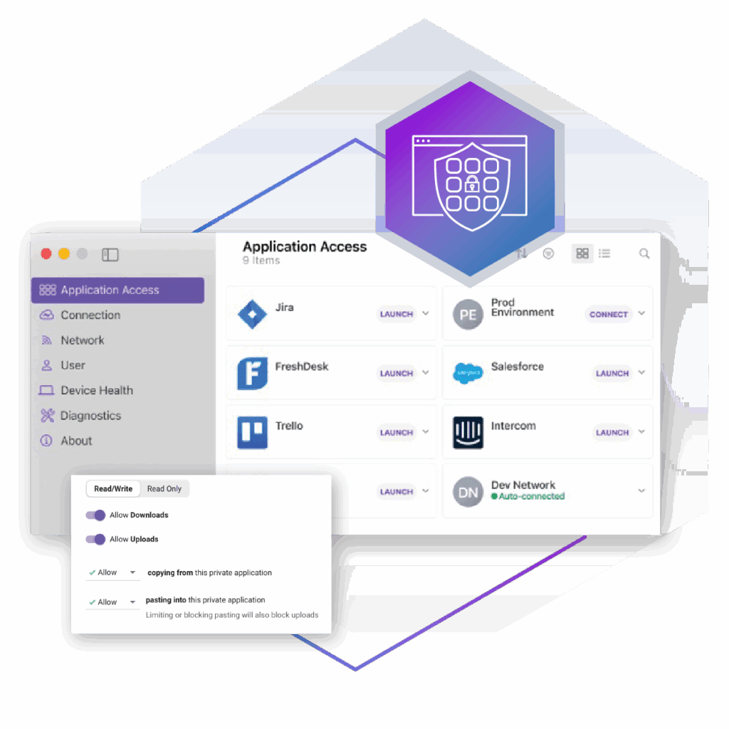 - Secure application access: Applies least-privileged, browser-based access to private web apps and SaaS, minimizing lateral movement risks from traditional VPN connections.