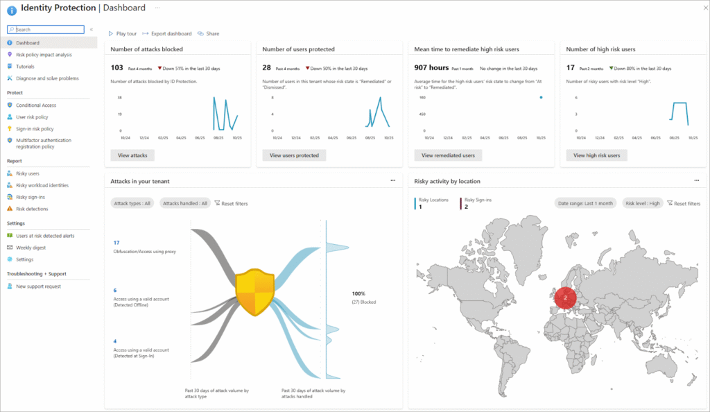 - Integrated MFA and risk detection: Uses Microsoft Entra ID Protection to detect identity threats and enforce multifactor authentication when risk thresholds are exceeded.