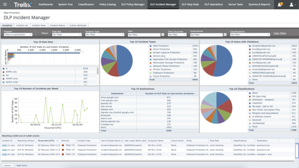 - Remediation capabilities: Supports automated workflows such as blocking, quarantining, encryption, and file redirection. Integrates with tools such as ServiceNow for incident handling.